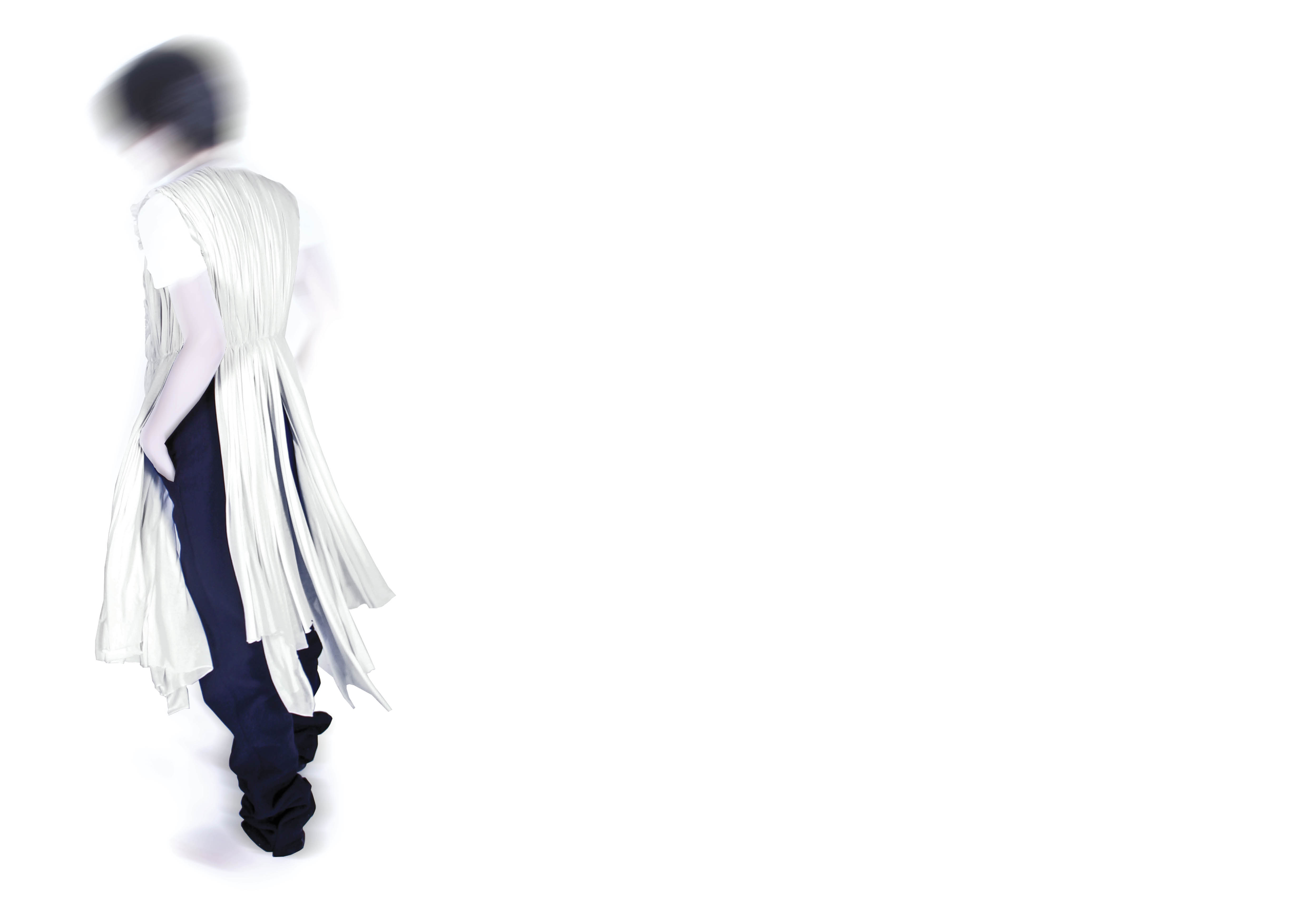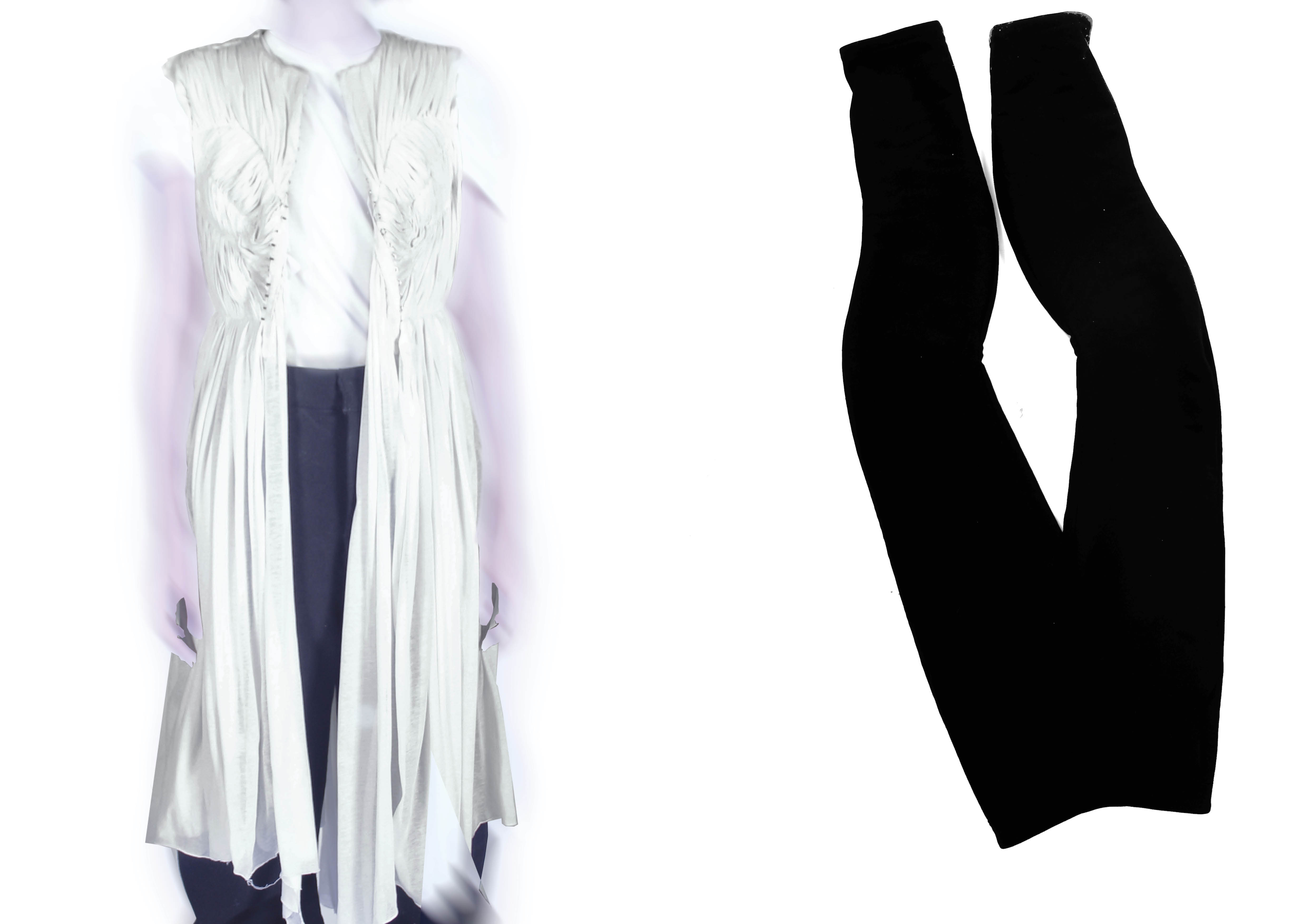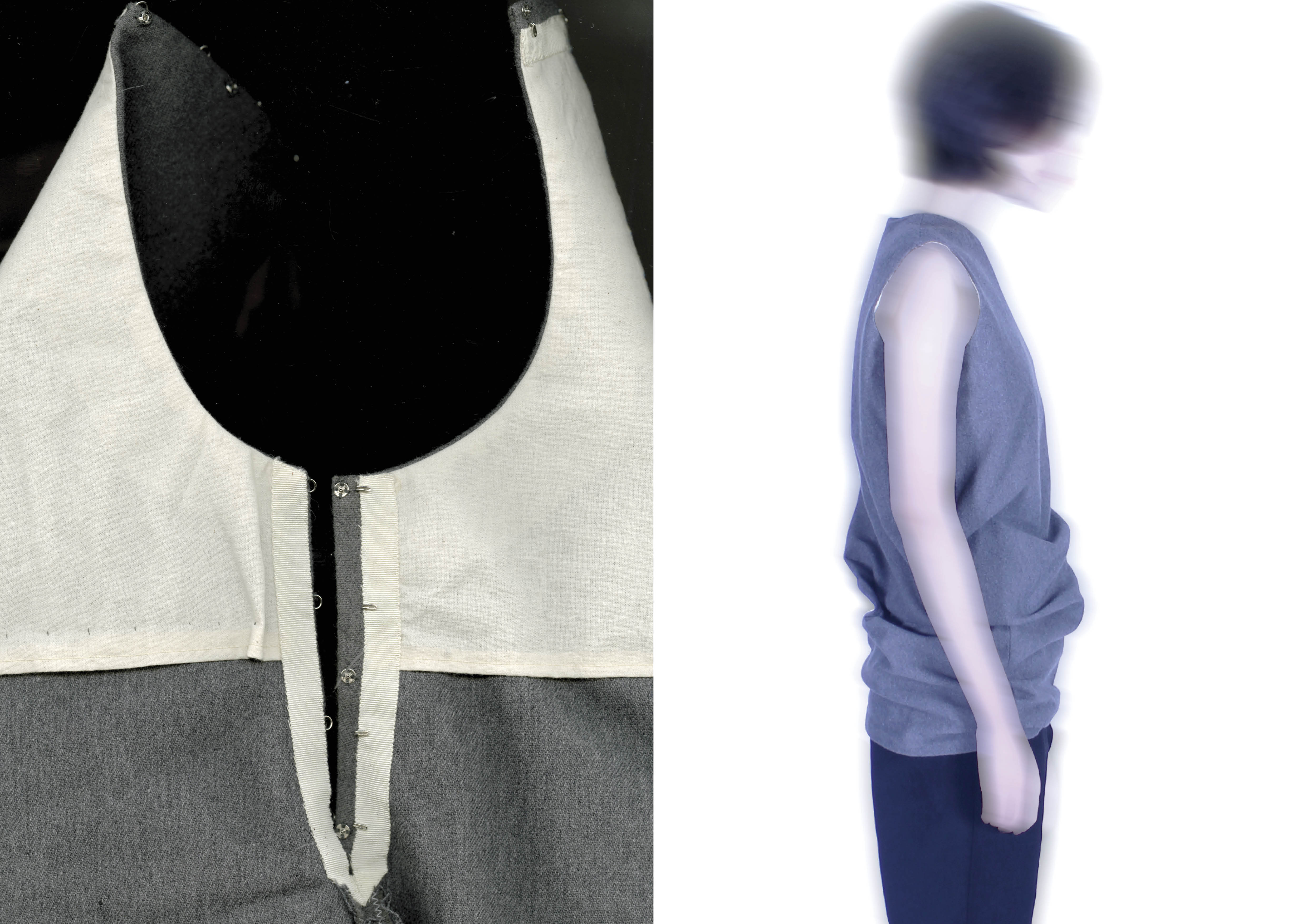 Warped construction top and trousers in wool flannel and wool interlock, lined in muslin.